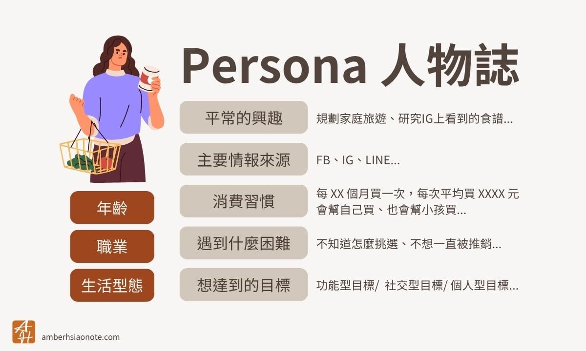 所以在畫顧客旅程地圖時,記得先想好一個前提--這張地圖是為哪一類客人設計的? 可以試著描述他的年齡、性別、職業、消費習慣、需求和目標,設定好顧客輪廓 (Persona)。